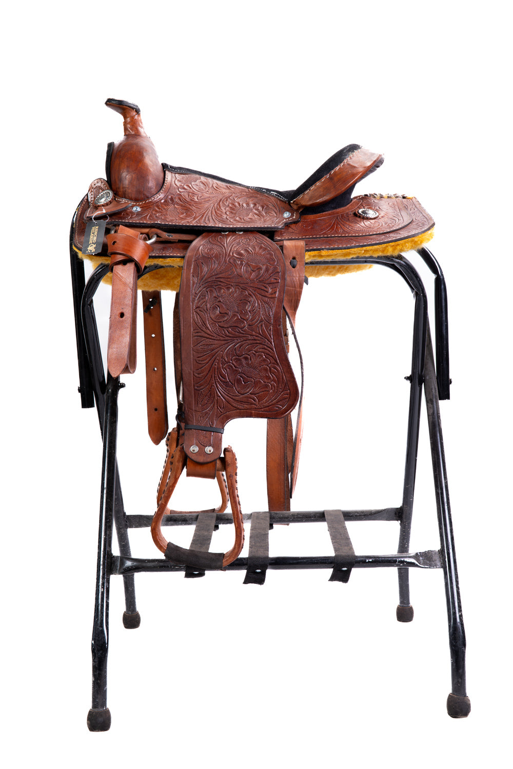 MONTURA TEXANA GRABADA COCIDA A MANO FUSTE 16 CHOCOLATE. Entregas de 3 a 4 semanas.