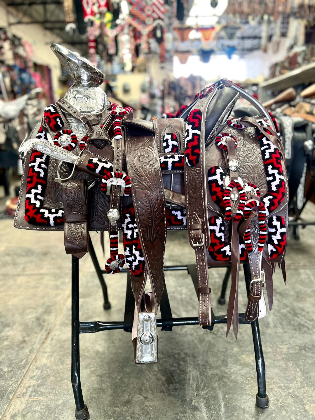 MONTURA CUADRADA CINCELADAS A MANO CHUMETEADO COLOR CHOCOLATE CON GRECA T ROJO NEGRO Y BLANCO FUSTE Y HERRAJE ACERO MONEL SABLE Y FUNDA PARA SABLE INCLUYE:...
