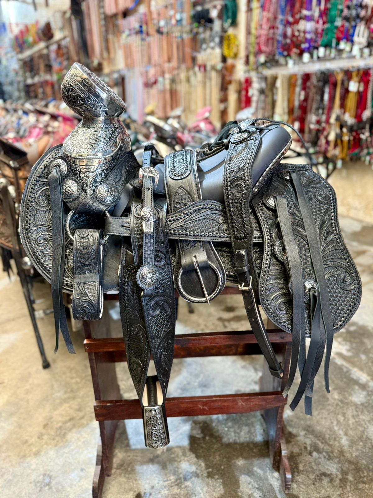 MONTURA COLA DE PATO NEGRA CON CANTINA GUARDA CINCELADAS MEDIA GALA Y HERRAJE EN ACERO MONEL INCLUYE: CINCHO PECHO PRETAL CABEZADA CORRELLONES