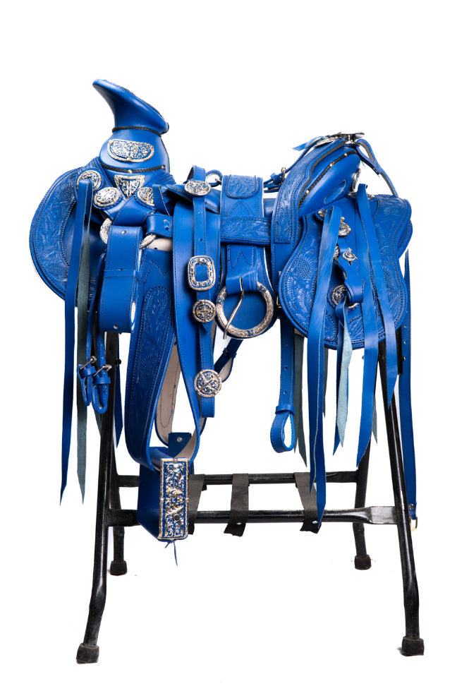 MONTURA COLA DE PATO CON CANTINAS GUARDA CINCELADAS AZUL CON MEDIA GALA Y HERRAJE ZAMAC JOYERO INCLUYE: CINCHO PECHO PRETAL CABEZADA RIENDA