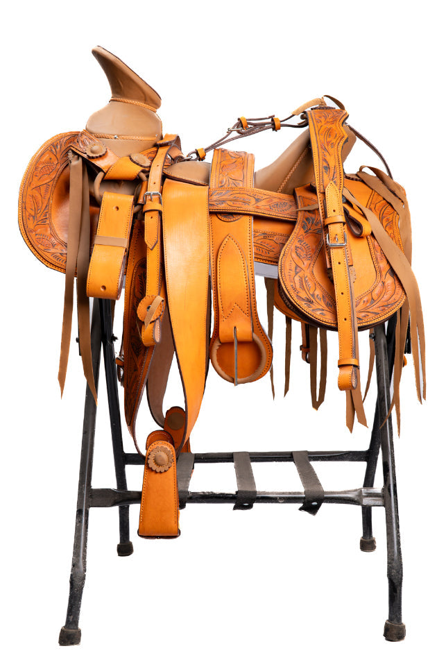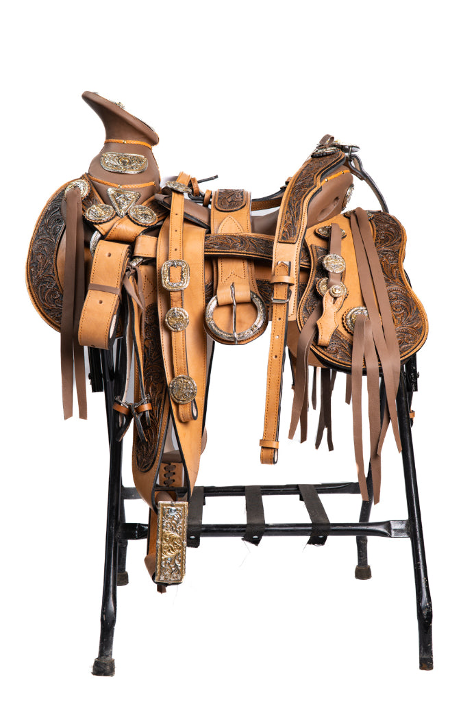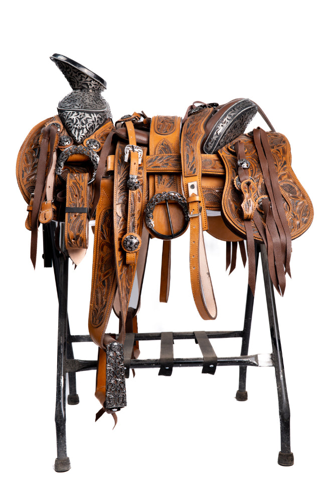 MONTURA CINCELADAS A MANO COLA DE PATO TABACO CON CANTINA FUSTE Y HERRAJE CALADO Y PAVONADO NEGRO INCLUYE: CINCHO PECHO PRETAL CABEZADA CORRELLONES