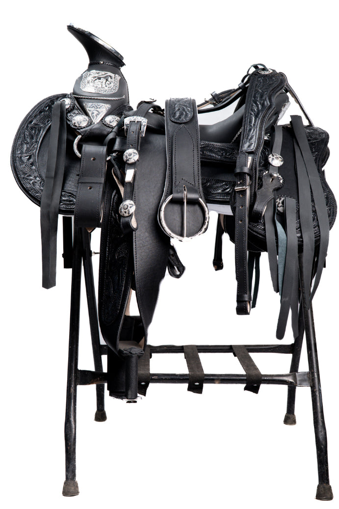 MONTURA COLA DE PATO NEGRA CON CANTINA GUARDA CINCELADAS MEDIA GALA Y HERRAJE EN ACERO MONEL INCLUYE: CINCHO PECHO PRETAL CABEZADA CORRELLONES