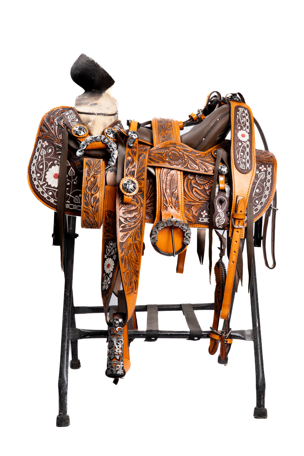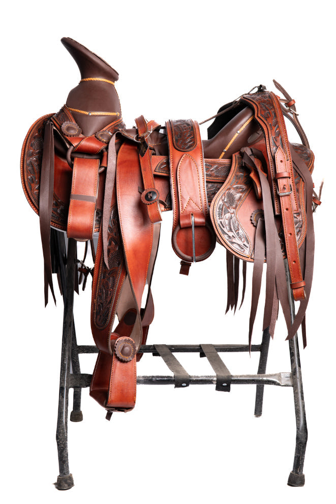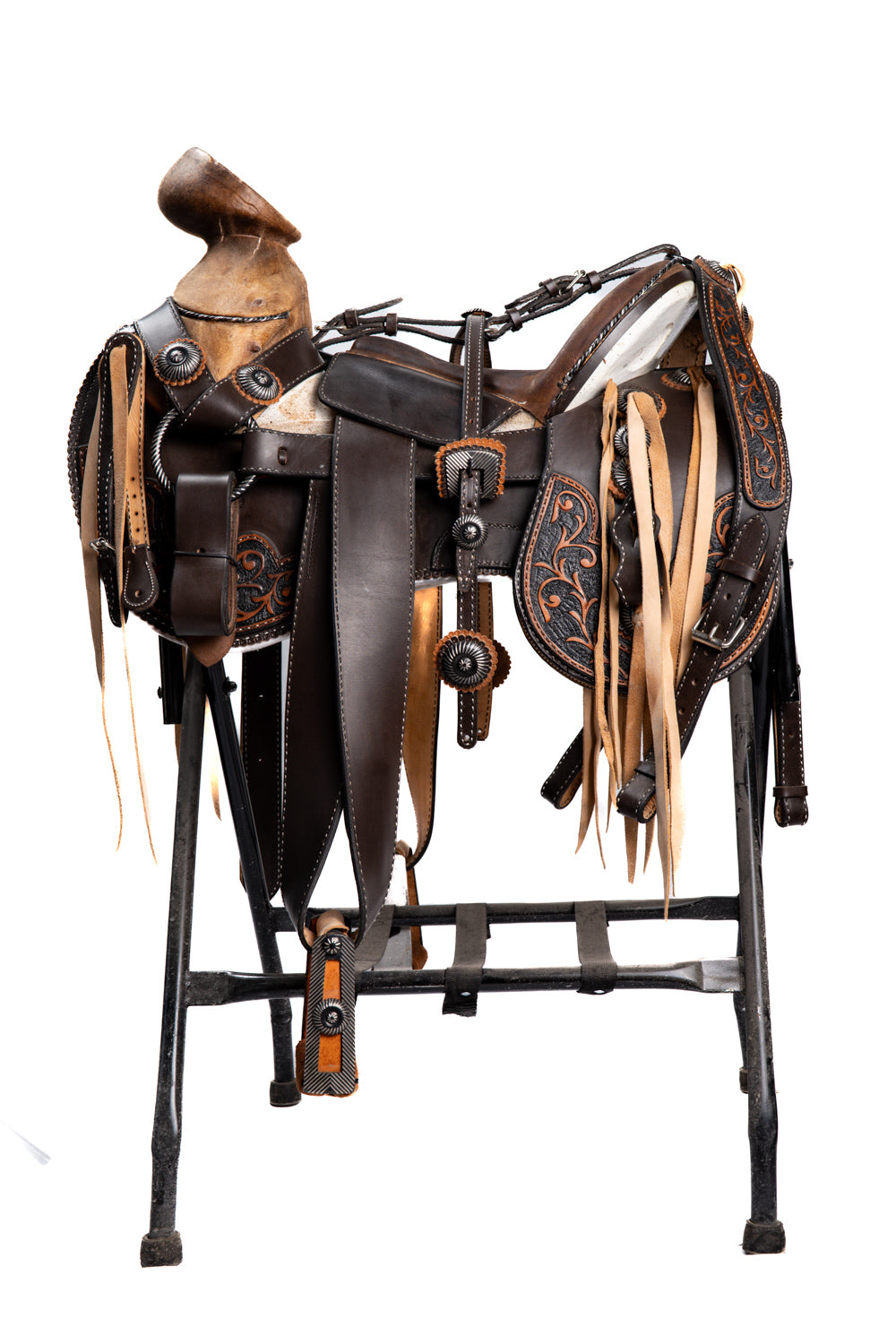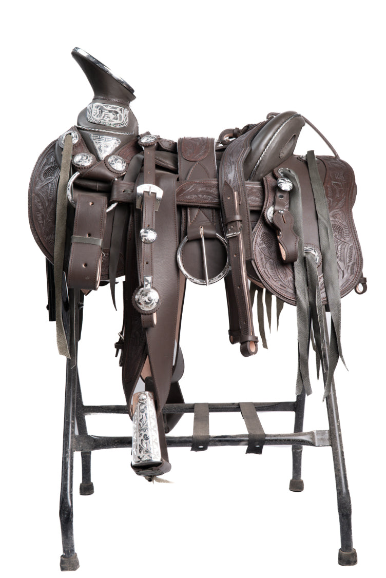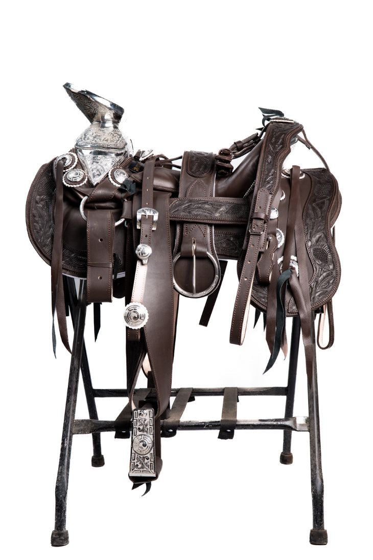 MONTURA CINCELADA COLA DE PATO CHOCOLATE FUSTE TURMA DE TORO MEDIA NARANJA HERRAJE PAVONADO INCLUYE: CINCHO PECHO PRETAL CABEZADA CORRELLONES