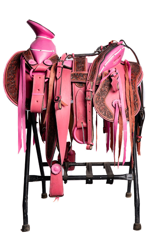 MONTURA DE GUARDA CINCELADAS ROSA COLA DE PATO CON CANTINA Y FUSTE FORRADO EN PIEL INCLUYE: CINCHO PECHO PRETAL CABEZADA CORRELLONES