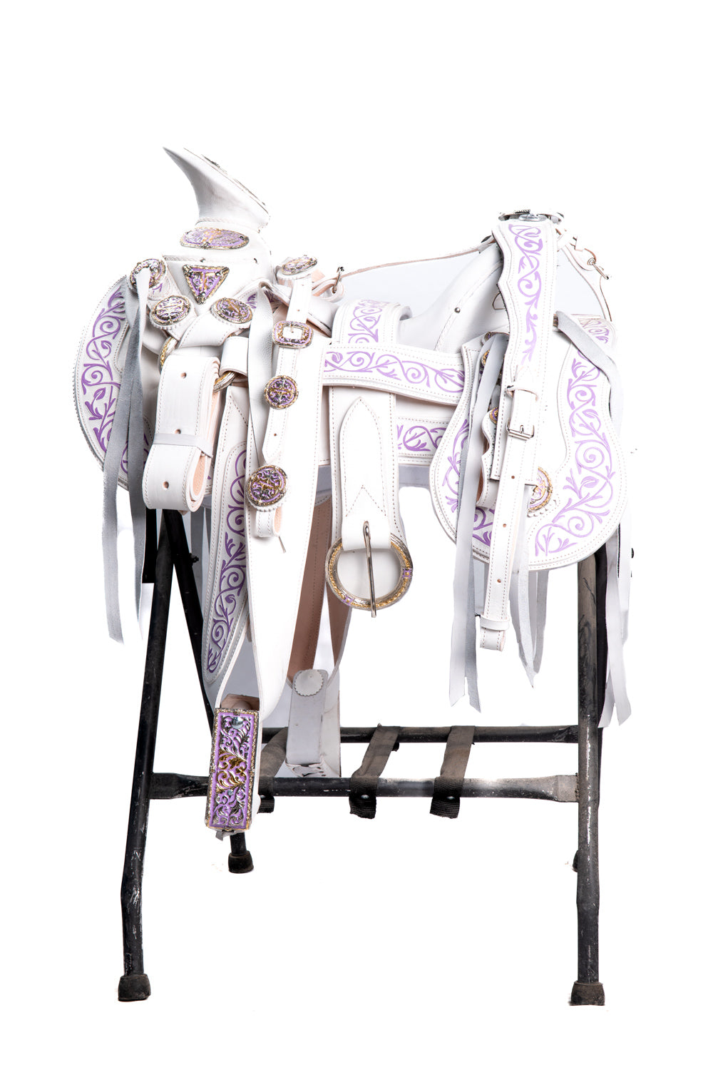 MONTURA COLA DE PATO CON CANTINA BLANCA CINCELADAS Y PINTADAS A MANO EN LILA GUARDA CINCELAD MEDIA GALA Y HERRAJE JOYERO ZAMAC CON FONDO LILA INCLUYE:...