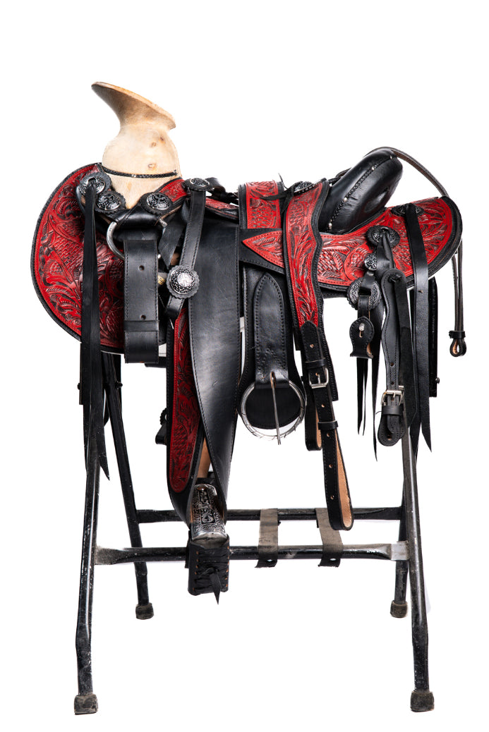 MONTURA DE GUARDA CINCELADAS NEGRA CON ROJO COLA DE PATO FUSTE NORMAL INCLUYE: CINCHO PECHO PRETAL CABEZADA CORRELLONES