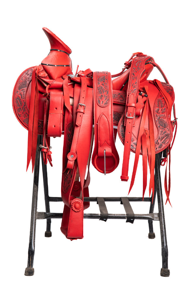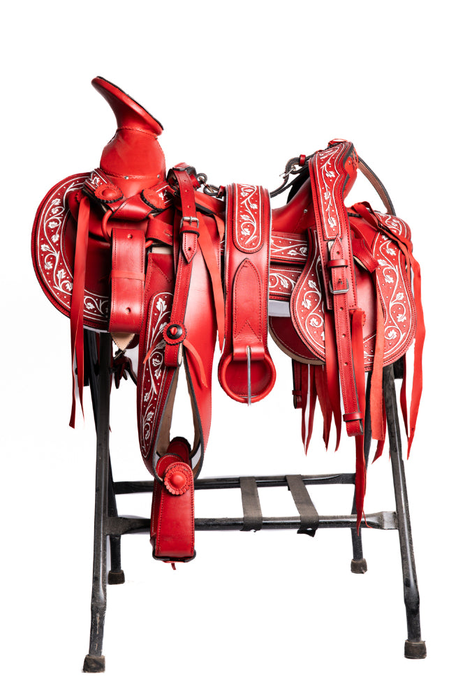MONTURA DE GUARDA CINCELADA PINTADA A MANO ROJO COLA DE PATO CON CANTINA Y FUSTE FORRADO EN PIEL INCLUYE: CINCHO PECHO PRETAL CABEZADA CORRELLONES
