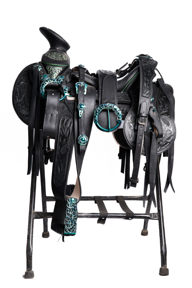 MONTURA COLA DE PATO GUARDA CINCELADAS CON CANTINA NEGRA CON MEDIA GALA Y HERRAJE CALADO Y PINTADO EN VERDE INCLUYE: CINCHO PECHO PRETAL CABEZADA CORRELLONES