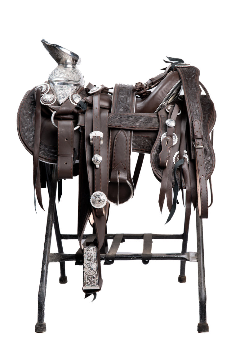 MONTURA COLA DE PATO CINCELADAS A MANO ROSA FUSTE Y HERRAJE MONEL INCLUYE: CINCHO PECHO PRETAL CABEZADA RIENDA