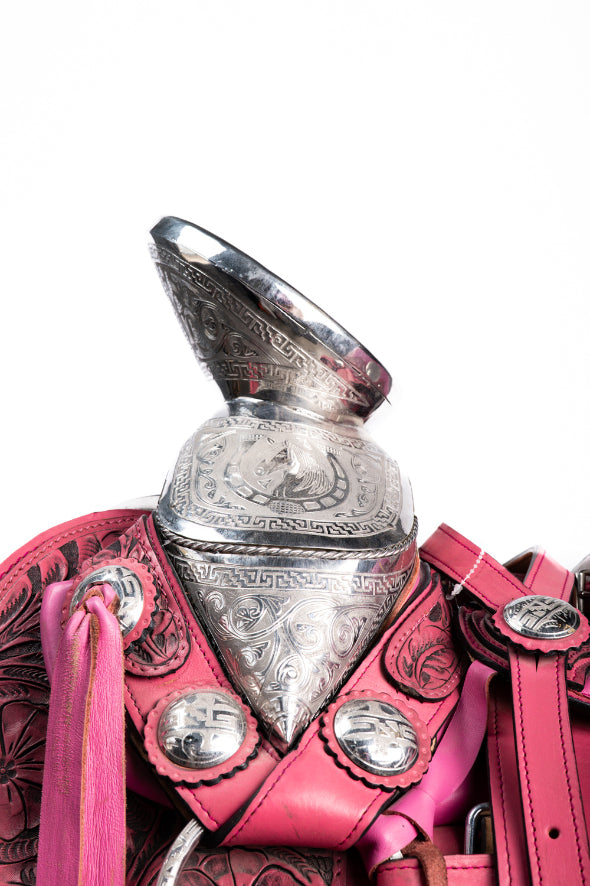 MONTURA COLA DE PATO CINCELADA A MANO ROSA FUSTE Y HERRAJE MONEL INCLUYE: CINCHO PECHO PRETAL CABEZAADA CORRELLONES