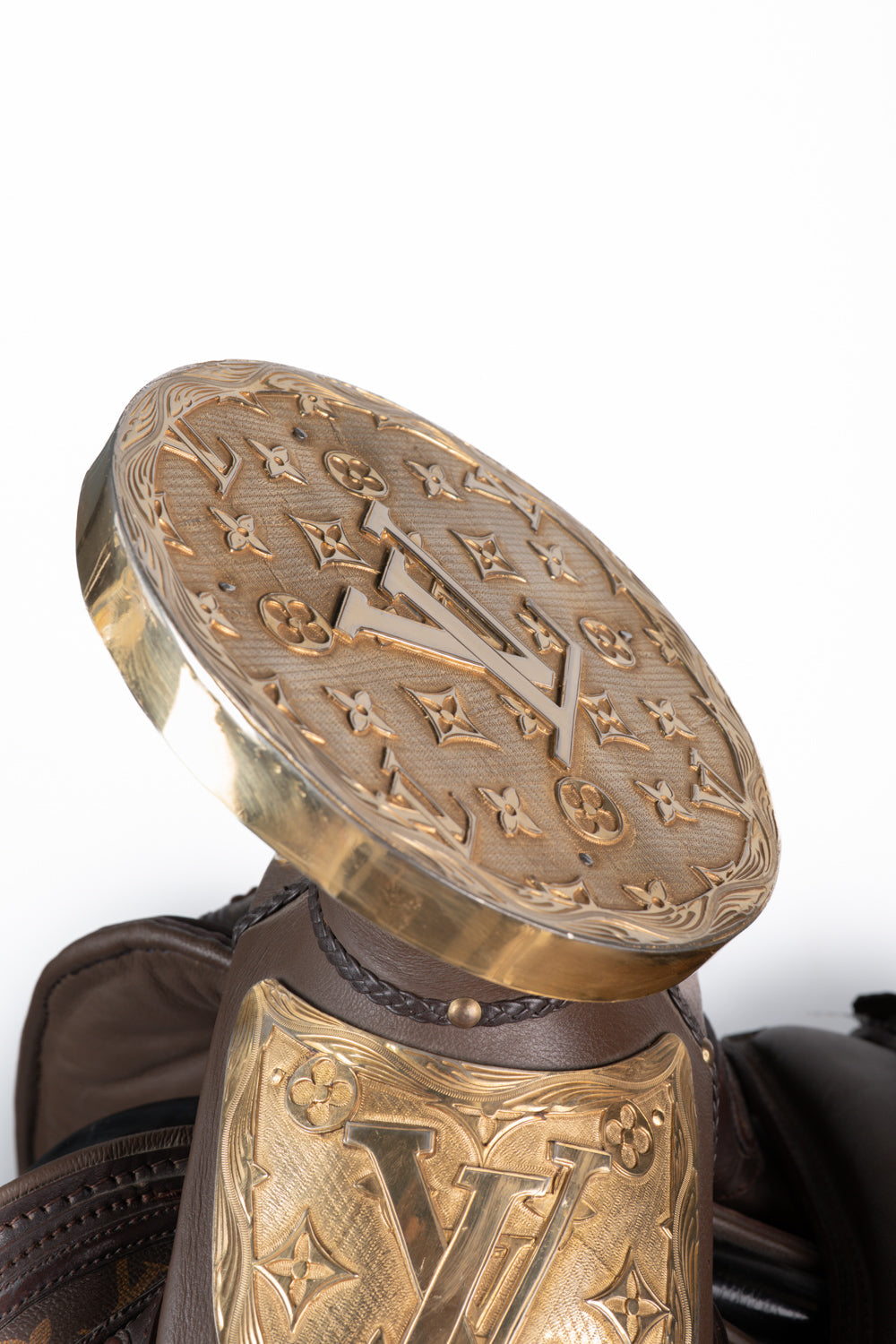 MONTURA CUADRADA CHOCOLATE MODELO LV MEDIA GALA Y HERRAJE DE ACERO CHAPEADO EN ORO INCLUYE: CINCHO PECHO PRETAL CABEZADA CORRELLONES POLAINAS
